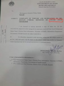 ڪراچي (ويب ڊيسڪ) سنڌ جي گهرو کاتي، آءِ جي سنڌ پوليس کان عوامي آواز جي رپورٽر رستم انڍڙ تي تشدد ڪندڙن خلاف ڪارروائي بابت رپورٽ طلب ڪري ورتي.