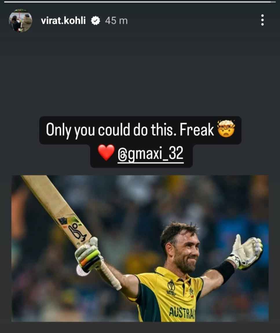 ڀارتي بيٽر ويرات ڪوهلي سوشل ميڊيا تي گلين ميڪسويل جي تصوير شيئر ڪندي لکيو ته هي سڀ غيرمعمولي هيو پر اِهو اوهان ئي ڪري سگهو پيا.