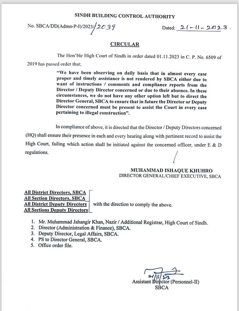جاري ڪيل نوٽيفڪيشن ۾ لکيو ويو آهي ته سنڌ هاءِ ڪورٽ 01.11.2023 تي سي پي نمبر 6509 آف 2019 ۾ حڪم جاري ڪيو آهي ته ”اسان روزاني بنيادن تي اهو مشاهدو ڪري رهيا آهيون ته تقريبن هر معاملي ۾ SBCA طرفان مناسب ۽ بروقت مدد فراهم نه ڪئي وئي آهي يا ته لاڳاپيل ڊائريڪٽر/ڊپٽي ڊائريڪٽر کان هدايتون/مشاهدو ۽ تعميل رپورٽن جي غير موجودگيءَ جي ڪري يا انهن جي غير موجودگيءَ جي ڪري.
