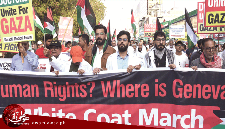 ڪراچي : اسرائيلي دهشتگردي خلاف وائيٽ ڪوٽ مارچ، ڊاڪٽرن جو وڏو انگ شريڪ