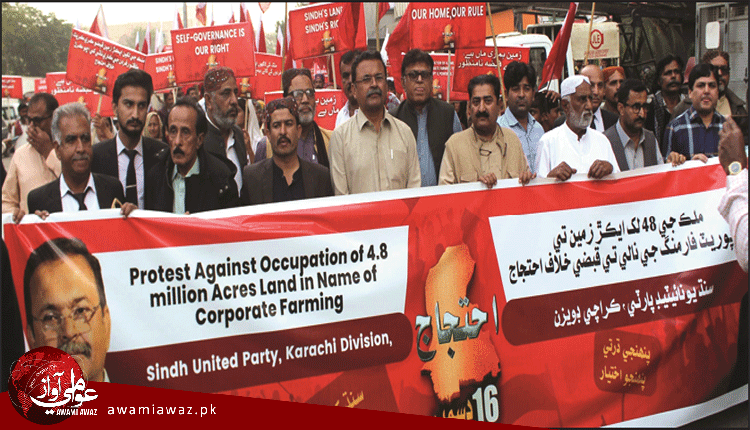 ڪراچي/حيدرآباد/سکر (نمائندن وٽان ) سنڌ يونائيٽيڊ پارٽي جي سڏ تي سنڌ جون زمينون ڪارپوريٽ فارمنگ حوالي ڪرڻ خلاف مختلف شهرن ۾ احتجاج مظاهرا ڪيا ويا. ايس يو پي جي سڏ تي ڪراچي سميت حيدرآباد،  ڄامشورو، نوابشاھه، سڪرنڊ، ميرپورخاص، لاڙڪاڻو،  عمرڪوٽ، سيوهڻ، دادو، شڪارپور، ٺل، جيڪب آباد، ڪشمور، ڪنڌڪوٽ، سکر، گهوٽڪي، ڏهرڪي، راڻيپور، مورو، ٺارو شاھه، نوشھروفيروز، بدين، سجاول، ڪوٽڙي، مانجهند، سن، ڀان سيد آباد، شھدادڪوٽ،گاجي کھاوڙ، نصير آباد، مٺي، نئون ڪوٽ، ٽنڊو آدم، ڊورونارو، پٿورو، راجا رستي، غلام نبي شاھه، خيرپور ناٿن شاھه، سيٺارجا، فيض گنج، جوهي، تنگواڻي سميت سنڌ جي مختلف شھرن ۾ ملڪ جي لکين ايڪڙ زمين ڪارپوريٽ فارمنگ جي خلاف احتجاجي مظاهرا ڪري ڌرڻا هنيا ويا،  جيڪب آباد ۾ مقبول احمد لاشاري، فدا لکڻ ۽ عبدالحميد سنڌي جي اڳواڻي ۾ احتجاج ڪيو ويو. سکر ۾ منير حيدر شاھه، جڳديش آھوجا، عيدن جاگيراڻي، بشير احمد لنڊ، عمران سامٽيو ۽ ٻين جي اڳواڻي ۾ احتجاج ٿيو. ڄامشورو ۾ پير بخش سهارڻ، آصف ڀلائي، محمد قمبراڻي، شاهنواز برفت ۽ ٻين جي اڳواڻي ۾ احتجاج ڪيو ويو، بدين ۾ ايس يو پي پاران سيد حيدر علي شاھه، دانش نور، جاني ملاح ۽ ٻين جي اڳواڻي ۾ احتجاج ٿيو. ڪوٽڙي ۾ ايس يو پي ليڊيز ونگ  طرفان احتجاجي مظاھرو عورتن ۽ ٻارڙن جي شرڪت ڪئي، ليڊيز ونگ جي مرڪزي اڳواڻ ياسمين ٿيٻو، پرھ محسن، نازيا سولنگي ۽ ٻين مظاهري جي اڳواڻي ڪئي. ٽنڊو محمد خان ۾ ايس يو پي جي ضلعي صدر عمران لغاري، جمن ملاح، فريد خواجه، منور سومرو ۽ ٻين جي احتجاجي جلوس ڪڍي پيادل مارچ ڪيو ويو. ڪنڌڪوٽ ۾ ايس يو پي آفيس کان دلمراد ڏاھاڻي،ظريت بجاراڻي،ڇوٽو جکراڻي ۽ ٻين جي اڳواڻي ۾ پريس ڪلب ريلي ڪڍي مظاهرو ڪيو ويو. سيوهڻ ۾ ڪارڪنن محمد نواز رند، مريد خان بروھي، علي اصغر سولنگي ۽ ٻين جي اڳواڻي ۾ مظاهر ڪيو. ميرپورماٿيلو ۾ ايس يو پي جي مرڪزي سڏ تي اڪرم علي ميتلو جي اڳواڻي ۾ ميرپور ماٿيلو ڊي ايڇ ڪيو پريس ڪلب کان ريلي ڪڍي وئي. شھداد ڪوٽ ۾ ايس يو پي ڪارڪنن حمل خشڪ، رميز تونيو، الھداد خشڪ ۽ ٻين جي اڳواڻي م ڌرڻو هنيو. نواب شاھه ۾ زين ڀٽو، گل حسن رند، مجيب ماڇي، فقير مصطفيٰ ڪيريو ۽ ٻين جي اڳواڻي ۾ سڪرنڊ روڊ کان ريلي ڪڍي وئي.  سنڌ جي زمينن تي والار خلاف ايس يو پي سن جي صدر عبدالستار سومرو، انور مڱڻهار، عنايت الله شاهاڻي، امام الدين ڇڇر جي اڳواڻي ۾ پارٽي جا جهنڊا کڻي ريلي ڪڍي وئي. حيدرآباد ۾ سنڌ يونائيٽيڊ پارٽي جي سڏ تي ڪارپوريٽ فارمنگ تحت ڏيھي ۽ پرڏيھي ڪمپنين ذريعي قبضي خلاف اولڊ ڪيمپس کان حيدرآباد پريس ڪلب تائين ايس يو پي جي سينيئر نائب صدر روشن علي ٻرڙي ۽ ٻين جي اڳواڻي ۾ ريلي ڪڍي وئي. نوشهروفيروز ۾ ايس يو پي پاران مهر علي وسطڙو، خادم سيال، جنيد وسطڙو ۽ ٻين جي اڳواڻي ۾ احتجاج ڪيو ويو ڪراچي ۾ سيد زين شاهه جي اڳواڻي ۾ پريس ڪلب اڳيان احتجاجي مظاهرو ڪيو ويو، مظاهرين کي هٿن ۾ پارٽي جا جهنڊا، احتجاجي پلي ڪارڊ ۽ بينر کنيل  هئا، احتجاجي مظاهري کي خطاب ڪندي سنڌ يونائيٽيڊ پارٽي جي مرڪزي صدر سيد زين شاهه چيو ته گرين پاڪستان جي نالي سان هڪ منصوبو ظاهر ڪيو ويو آھي، جيڪو ملڪ لاءِ زهر آهي، اسان سون جي ڪاغذ ۾ ويڙهيل زهر ڪنهن به صورت ۾ قبول نه ڪنداسين، پي ڊي ايم ۽ پيپلز پارٽي سنڌ صوبي جا اختيار ختم ڪري وفاق حوالي ڪري ڇڏيا آهن. احتجاجي مظاهري کي ايس يو پي مرڪزي نائب صدر ايڊوڪيٽ امير آزاد پنھور،منير احمد نائچ، سيد غلام شاھ،جلال شاهه بخاري، خدا ڏنو شاهه، منير مگسي، خادم ٻرڙو ۽ ٻين پڻ خطاب ڪيو.