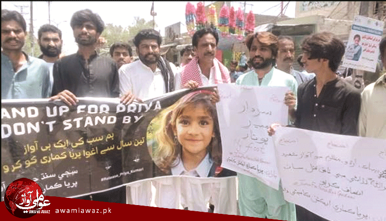 دادو(رپورٽ: غوث جهتيال) سنڌ ڄائي معصوم نياڻي پريا ڪماري جي آزاديءَ لاءِ پريا ڪماري ايڪشن ڪاميٽي جي سڏ تي هٿن ۾ بينر ۽ پلي ڪارڊ کڻي سئنيما چوڪ کان دادو پريس ڪلب تائين احتجاجي مظاهرو ڪيو ويو، اڳواڻن اعجاز ملڪاڻي، منصور پنهور، عبدالحميد ميمڻ، شعيب مزناڻي، اعجاز ملاح، احمد ملاح، اسرار هيسباڻي، سارنگ چنه، سڪندر کوکر، فراز لغاري، ڪامريڊ مدثر وگهيو، مولاداد لنڊ، عرفان پنهور، سڄڻ کوکر، سراج سومرو، وقار سومرو ۽ ٻين ميڊيا سان ڳالهائيندي چيو ته ڳچ عرصو گذرڻ باوجود سنڌ سرڪار پريا ڪماري کي آزاد ڪرائڻ ۾ ناڪام ٿي وئي آهي، آءِ جي سنڌ توڙي سنڌ جا حڪمران معصوم نياڻي پريا ڪماري جي آزادي لاءِ سجيده ناهن، ادارا سجينده هجن ها ته هن وقت تائين پريا ڪماري بازياب ٿي پنهنجن والدين وٽ پهچي وڃي ها، مظاهري ۾ اقليتي برادري جي اڳواڻن، سول سوسائٽي جي نمائندن، استادن، شاگردن سميت مختلف مڪتب فڪر سان تعلق رکندڙ شهرين احتجاج ۾ شرڪت ڪئي.