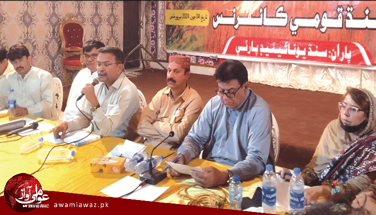 ميرپورخاص (بيورو/ پ ر) سنڌ يونائيٽيڊ پارٽي جي ميزباني ھيٺ ميرپورخاص شھر ۾ ”وفاق اندر سنڌ کي درپيش خطرا ۽ چلينج“ جي  عنوان ھيٺ ھڪ خانگي ھوٽل ۾ هڪ ڏينهن جي سنڌ قومي ڪانفرنس منعقد ڪئي وئي، جنھن ۾ ميرپور خاص، عمرڪوٽ ۽ ٿرپارڪر ضلعن جي سڄاڻ ڌرين شرڪت ڪئي، سنڌ قومي ڪانفرنس کي خطاب ڪندي سنڌ يونائيٽيڊ پارٽي جي مرڪزي صدر سيد زين شاھ چيو ته مختلف وقتن ۾ پاڪستان پنھنجي پرڏيهي پاليسي وڪڻي ملڪ ۾ پيسو آندو ۽ اهو عمل خاص ڪري ضياء ۽ مشرف جي دور ۾ عام ھو جنھن جا مثال اوهان کي افغان جنگ ۾ نظر ايندا، هاڻي سنڌ ۾ پ پ پنهنجي حڪومت کي ڊيگهه ڏيڻ لاء سنڌ جو سودو ڪيو آھي جنهن ۾ وفاقي حڪومت سان معاهدا ڪري سنڌ جا ٻيٽ، زرعي زمينون، پاڻي، معدنيات ۽ ٻيا وسيلا کپائي ڏنا آھن. سنڌ مان ڪرپشن تحت پيسو ڪٺو ٿي ٻاهر وڃي ٿو ۽ وري واپس ۾ سفيد ناڻو ٿئي ٿو. ھن ملڪ ۾ جنرلن جي مقرري توڙي معاشي آمدني ۽ قرض ٻاهرين قوتن جي ڪنٽرول ۾ آھي.اسان خوشحال سنڌ جو خواب کڻي اوهان وٽ آيا آھيون اوهان جي ساٿ ۽ سهڪار سان سنڌ خودمختيار ٿيندي، اگر اسان هاڻي سجاڳ نه ٿياسين ته زرعي زمين سان گڏوگڏ سنڌ جا وسيلا به تين وال ڪيا ويندا. ڊاڪٽر شميم مري خطاب ڪندي ترقي جي نالي ۾ ايندڙ بجيٽ ۾ ڪرپشن جا انگ اکر ٻڌايا جن ڪري سنڌ ۾ ۽ خاص ڪري ميرپورخاص ۾ ترقي نالي ماتر ئي آھي. ايس يو پي جي مرڪزي سينئير نائب صدر روشن علي ٻرڙو،مرڪزي جنرل سيڪريٽري جڳديش آھوجا،مرڪزي نائب صدر امير آزاد پنھور،نائب صدر عارف نياز آرائين کان علاوه عبدالمومن ميمڻ،علي حسن لغاري،مير اعجاز ٽالپر، قاسم شاھ پنھنجي خطاب دوران سنڌ ۾ بدحال معشيت تباھ حال ادارا ڪرپشن ۽ سنڌ دشمن منصوبن تي ڳالهايو.خالد جوڳي خطاب ڪندي سنڌي ٻولي کي موجود خطرن تي ڳالهائيندي چيو ته ٻولي اها زنده رهندي جيڪا مارڪيٽ ۾ رهندي.
