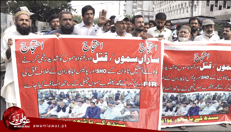 ڪراچي /حيدرآباد (نمائندن وٽان) ڪراچي اسٽيل ٽائون پوليس جي فائرنگ ۾ 2 هفتا اڳ قتل ٿيل سائرن سمون ۽ زخمي ٿيندڙ ڌيءَ واري واقعي جو مرضي موجب ڪيس داخل نه ٿيڻ خلاف سمان برادري پاران مختلف شهرن ۾ احتجاجي مظاهرا شروع ٿي ويا آهن، ان سلسلي ۾ گڏ ڪيل ڄاڻ موجب، ٺٽي ۾ سمان برادري جي معزز محمد يعقوب سمون، ايڊووڪيٽ اشرف سمون، وڏيرو احمد سمون، شبير سمون، ملاح اڳواڻ ڏاڏا آدم گندرو، پير گلاب شاھه، اياز لاشاري، قادر موليپوٽو، عبدالله آدم گندرو، طفيل سمون، جميل سمون، بلاول سمون ۽ ٻين جي اڳواڻي ۾ احتجاج ٿيو، بدين ۾ شاهنواز سمون، آزاد سمون، محمد عمر سمون، علي نواز سمون، عبدالرسول سمون ۽ يونائيٽڊ پارٽي جي مرڪزي اڳواڻ امير آزاد پنهور جي اڳواني ۾ احتجاجي مظاهرو ڪيو ويو، هوڏانهن ٽنڊي محمد خان ۾ الفتاح چوڪ کان پريس ڪلب تائين ريلي وئي، جنهن جي اڳواڻي حاجي محمد صديق سمون، عجائب سمون، محمد صالح سمون، علي نواز سمون، سول سوسائٽي جي عبدالحفيظ سٺيو، ڪائونسلر محمف جمن ڪيھر ۽ ٻين ڪئي. ٻئي طرف ڪراچي پريس ڪلب ٻاهران حاجي محمد حنيف سمون، ممتاز سمون ۽ فاروق سمون جي اڳواڻي ۾ احتجاجي مظاهرو ٿيو، اڳواڻن مطالبو ڪيو ته مقتولا جي وارثن جي مرضي موجب ڪيس داخل ڪري قتل ۾ ملوث اهلڪارن خلاف ڪارروائي ڪئي وڃي.