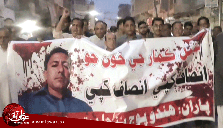 پنوعاقل ( رپورٽ : رستم انڍڙ) سکر سينٽرل جيل ۾ پراسرار نموني فوت ٿيل پنوعاقل واسي ھندو نوجوان چيتن ڪمار جي وارثن ، ھندوپنچائت ۽ سول سوسائٽي طرفان ريلي ، شھر جو گشت ، مندر گلي کان سانول چوڪ تائين ريلي ڪڍي سخت نعريبازي ڪئي وئي . سکر سينٽرل جيل ۾ پراسرار نموني فوت ٿيل پنوعاقل واسي ھندو نوجوان چيتن ڪمار جي خون سان انصاف لاءِ ھندو پوج پئنچائت ، ھنڌو پنچائت ۽ سول سوسائٽي طرفان احتجاجي ريلي ڪڍي وئي ،چيتن ڪمار جي خون سان انصاف لاءِ مندر گلي کان سانول چوڪ تائين ريلي ڪڍي سخت نعريبازي ڪئي وئي ، مظاھرين ڊاڪٽر ھري لعل ، مکي پربداس، مکي دريانو مل ، سنتوش ڪمار ۽ ٻين جو چوڻ ھو ته چيتن ڪمار کي پنوعاقل پوليس ۽ سينٽر جيل پوليس تشدد جو نشانو بڻايو جنھن ڪري موت واقعو ٿيو.