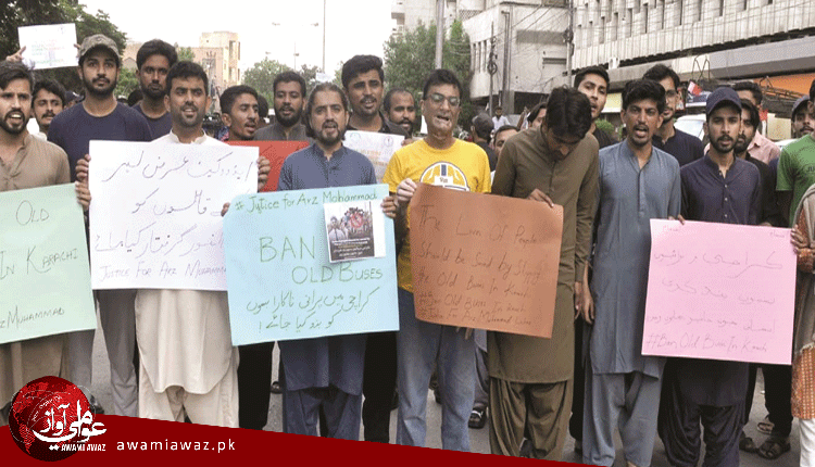 ڪراچي(رپورٽر)شھيد ذوالفقار علي ڀٽو يونيورسٽي آف لاءِ ڪراچي (زيبل) ۽ ٻين يونيورسٽين جي شاگردن بس جي ٽڪر سان فوت ٿيندڙ قانون جي شاگرد عرض محمد لھر جي خون سان انصاف ۽ ڪراچي ۾ پراڻيون بسون بند ڪرڻ  لاءِ ڪراچي پريس ڪلب آڏو احتجاج ڪيو ويو، مظاهرين طرفان هٿن ۾ پلي ڪارڊ کڻي سخت نعريبازي ڪئي وئي. ان موقعي تي احتجاج ڪندڙن جلال شاھ، آصف ڀٽو، رحمت پتافي، اسمه حسن، سرمد لنڊ ۽ ٻين عوامي آواز سان ڳالهائيندي چيو ته  ڪراچي ۾ ھلندڙ ناقص ٽرانسپورٽ، کٽارا ۽ پراڻيون بسون ھلندڙ گھمندڙ موت جو راڪاس آھن، بسن جي ڊرائيورن وٽ نه ڪو لائسنس آھي ۽ نه ئي اھي گاڏيون روڊن تي پبلڪ ٽرانسپورٽ ھلڻ جھڙيون آھن، تازو 20 نمبر بس جي ڊرائيور جي غفلت ۽ تيز رفتار سبب قانون جو شاگرد شھيد عرض محمد لھر جواني ۾ پنھنجي حياتي وڃائي ويٺو، پوليس ھٿ وٺي ڊرائيور بس کي ڪجھ پئسن عيوض ڀڄايو ۽ بعد ۾ وڪيلن جي پريشر ھيٺ فرضي ماڻھو ظاھر ڪيا آھن. ھنن مطالبو ڪيو آھي ته قاتل ڊرائيور خلاف قانوني ڪاروائي ڪري،