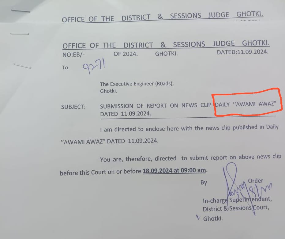 ڊسٽرڪٽ اينڊ سيشن جج گھوٽڪي عبدالقدوس ميمڻ جي عدالت ايگزيڪيوٽو انجنيئر روڊس کي ھڪ ليٽر نمبر 9271 جاري ڪندي عوامي آواز پاران تاريخ 11.09.2024 تي لاکو لنجاري روڊ جو ڪم مڪمل نه ھجڻ ۽ ڪم رولڙي جو شڪار ھجڻ واري خبر جو ذڪر ڄاڻائيندي نوٽيس جاري ڪندي 18 سيپٽمبر تي رڪارڊ سميت طلب ڪري ورتو آھي.