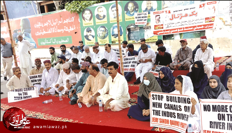 ڪراچي (رپورٽر) جيئي سنڌ قومي پارٽي پاران سنڌو نديء مان ڇھ نوان ڪئنال ڪڍڻ ڪالاباغ ڊيم سميت ٻيا ڊيم ٺاھڻ ۽ ارسا ايڪٽ ۾ ترميم خلاف پريس ڪلب ڪراچي اڳيان پارٽي چيئرمين نواز خان زئور محمد علي خشڪ صوفي حاجن گل، شاهد سومرو، فراز سنڌي ۽ قومي ناري تحريڪ جي اڳواڻ عروج آزاد جي اڳواڻي ۾ احتجاجي بک ھڙتال ڪئي وئي. احتجاج ۾ عوامي جمھوري پارٽي جي اڳواڻ حريف چانڊيو، اسلم بلوچ، پروفيسر مشتاق ميراڻي، شھاب اوستو، الاهي بخش چاچڙ، وقار ميراڻي سميت عورتن ۽ ڪارڪنن يڪجهتي طور شرڪت ڪئي. ان موقعي تي هنن چيو ته سنڌوء درياه تي ڪئنالن ۽ ڊيمن جون رٿائون سنڌ دشمن ۽ درياه دشمن رٿائون آهن پنجاپ کي آباد ڪرڻ لاء سنڌ کي سڪايو ۽ درياھ کي تباهه ڪيو پيو وڃي اهي رٿائون قدرتي ايڪو سسٽم ۽ ماحوليات دشمن رٿائون آهن، پارٽي اڳواڻ نواز زئور چيو ته سنڌو دريا ۽ ان جي ڇوڙ واري علائقي سميت سموري سنڌ تباهي جي ور چڙهي ويندي ۽ درياه تي قبضو ڪرڻ لاء ئي اهي رٿائون آنديون پيون وڃن. هن اعلان ڪيو ته قومي پارٽي پاران ڪئنالن ۽ ڊيمن خلاف 10 نومبر تي جهوڪ کان بٺوري تائين پيادل مارچ ڪيو ويندو ۽ 24 نومبر تي ٽنڊي محمد خان ۾ گڏيل ريلي رهبر ڪميٽي پاران ڪڍي ويندي. هن وڌيڪ چيو ته گرين انيشئيٽو جي زمينن کي آباد ڪرڻ لاء سنڌ جي زراعت کي تباه ڪيو پيو وڃي.