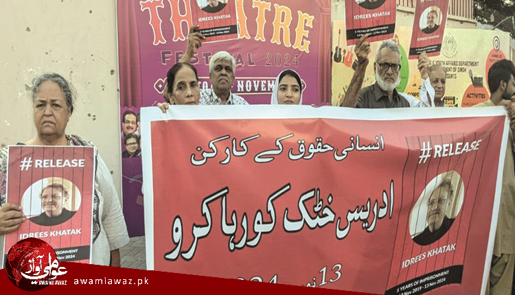 ڪراچي(رپورٽر)آرٽس ڪائونسل آف پاڪستان ڪراچي ٻاهران هيومن رائيٽس ايڪٽوسٽ، ڊيموڪريٽڪ اسٽوڊنٽس فيڊريشن اڳواڻ ادريس خٽڪ جي آزادي ۽ کيس بيگناھ سزا ملڻ خلاف ادريس خٽڪ رهائي ڪميٽي طرفان احتجاجي مظاهرو ڪيو ويو، مظاهرين طرفان هٿن ۾ پلي ڪارڊ ۽ بينر کڻي ادريس خٽڪ جي آزادي لاءِ نعريبازي ڪئي وئي. ان موقعي تي احتجاجي مظاهرو ڪندڙ سينئر صحافي وارث رضا، ناصر آرائين، معين قريشي، ، عمر فاروق، شاهينا رمضان، خالد زدران ۽ ٻين چيو ته ترقي پسند اڳواڻ ادريس خٽڪ کي 2019 ۾ ادارن طرفان پشاور اسلام آباد ويندي کنڀيو ويو جنهن کي فوجي عدالت ۾ پيش ڪري کيس 14 سال جي سزا ٻڌائي وئي، جنهن کي اڄ 5 سال مڪمل ٿي ويا آهن، ادريس خٽڪ جو ڪيس سول ڪورٽ نٿو هلايو ٿو وڃي. هنن وڌيڪ چيو ته پشاور هاءِ ڪورٽ ۾ درخواست داخل ٿيل آهي پر هن وقت تائين ادريس خٽڪ جو ڪيس سول ڪورٽ ۾ نه ٿو هلايو وڃي. هنن مطالبو ڪيو ته جلد کان ادريس خٽڪ کي آزاد ڪيو وڃي ۽ سندس جو ڪيس سول ڪورٽ ۾ هلايو وڃي.