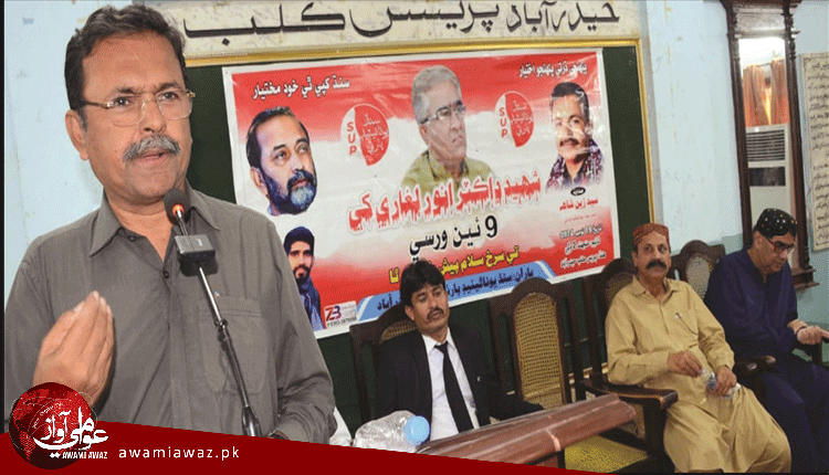 حيدرآباد(رپورٽر) سنڌ يونائيٽيڊ پارٽي جي صدر ۽ سنڌو درياهه بچايو ڪميٽي جي ڪنوينر سيد زين شاھه چيو آهي ته گرين پاڪستان انيشيٽو ۽ ايس آءِ ايف سي جي منصوبن ذريعي زرعي شعبي ۾ زمينون ڊگھي مدي لاءِ ليز تي هليون وينديون، انهن جي وارثي نه وفاق وٽ هوندي ۽ نه ئي صوبن جو ڪو اختيار رهندو، ملڪ ۾ هن وقت ون يونٽ کان وڌيڪ خراب ون يونٽ لاڳو ڪيو پيو وڃي، قومي وحدتن جون زمينون ۽ وسيلا ادارن جي مستقل قبضي ھيٺ اچي ويندا، سنڌ ۾ حڪمران جماعت سياست اندر ڪانٽريڪٽر ۽ ايجنٽ وارو ڪردار ادا ڪري رهي آهي. اهڙن خيالن جو اظهار هن ڪالهه حيدرآباد پريس ڪلب ۾ ايس يو پي ضلعي حيدرآباد پاران شھيد ڊاڪٽر انور لغاري جي نائين ورسي جي مناسبت سان منعقد ڪيل تقريب کي خطاب ڪندي ڪيو. سيد زين شاهه چيو ته ڊاڪٽر انور لغاري حساس طبعيت جو مالڪ ھو، سندس قتل ۾ اهي ماڻھو ملوث آھن جن چونڊن ۾ قومپرست جمهوري سياست جي رستا روڪ ڪرڻ پئي چاھي، هن چيو ته سائين جي ايم سيد وطن سان عشق جو درس ڏنو، ھن دنيا جي جديد معاشرن سان گڏ بيھڻ جو تصور ڏنو، جيڪڏھن پاڻ ارپڻ جو جذبو پيدا ڪجي ته انقلاب ممڪن بڻجي سگھي ٿو. عملي سياست کي قومي جمھوري سياست سان جوڙي اڳتي وڌڻ گھرجي. هن چيو ته ملڪ ۾ عدم استحڪام آھي، سياست ۽ اقتدار ۾ شراڪتداري ڪري حالتون خراب آهن، ملڪ وڪرو ڪرڻ جو ھوڪو پيو ھلي، زمينون ۽ وسيلا ليز تي ڏيڻ جون ڪوششون ڪيون پيون وڃن. هن معاشي ماهر قيصر بنگالي جي ان ڳالهه جو ذڪر ڪيو ته حڪمران ملڪ جا ادارا ۽ ٻيا وسيلا نيلامي جي لاءِ پيش ڪري رھيا آھن پر ڪير وٺڻ لاءِ تيار ناھي. هن چيو ته نوجوان ھتي رھڻ بجاءِ ملڪ ڇڏڻ چاھين ٿا. ملڪ جا اثاثا گھٽجن پيا ۽ ڪمپني سرڪار جا اثاثا وڌن پيا. هن چيو ته سنڌو درياهه مان 6 ڪئنال نڪتا ته سرائڪي وصيب وارا چون ٿا ته سندن لکين ايڪڙ زمين قبضي ھيٺ هلي ويندي ۽ سنڌ جي ته زمين ۽ پاڻي ٻئي کسجي ويندا. هن چيو ته ڪئنال ڪڍي سنڌ کي برباد ڪرڻ وارا منصوبا عوامي جدوجھد ذريعي روڪي سگھجن ٿا. 1991ع ٺاھه تي به عمل نه ٿيڻ سبب انڊس ڊيلٽا تاريخ تان مٽجي چڪي آھي ۽ جيڪڏهن هاڻ 6 ڪينال ڪڍي اھڙن سنڌ دشمن منصوبن تي عمل ٿيو ته سنڌ جي زمين بنجر بڻجي ويندي . هن چيو ته سموريون طاقتون ھڪ پاسي آهن ۽ اسان ان ناانصافي کي ڏسندي سنڌ جي ڪروڙين ماڻهن ۾ سجاڳي پيدا ڪرڻ لاءِ نڪتا آهيون، ايس يو پي جي سينيئر نائب صدر روشن ٻرڙي چيو ته ڊاڪٽر انور لغاري سڄي زندگي نظرياتي سياست جي پاسي بيٺل رھيو. شاگرد سياست واري دور ۾ جڏھن به شاگرد سياست ۾ ٽڪراءُ ٿيندو ھو ته ڊاڪٽر انور لغاري ان کي روڪيندو ھو. امير آزاد پنھور چيو ته ڊاڪٽر انور لغاري سنڌ جي قومپرست جمھوري سياست جو شھيد آھي. ڊاڪٽر انور لغاري پنھنجي پيشي ۽ قومي مقصد سان نڀايو. سندس خاندان سنڌ جو عاشق آھي. هن چيو ته سنڌو درياهه جي بقاء سنڌ جي بقاء آھي. درياهه تي ڌاڙو ھڻڻ نه ڏينداسين. سنڌ صوفي فورم جي صدر ڊاڪٽر بدر چنا چيو ته سنڌ جي قومي تحريڪ جي بنيادن رکڻ ۾ ڊاڪٽر انور لغاري ۽ ان جي خاندان جو اھم ڪردار آھي. ھن چيو ته اڄ سنڌو درياھه کي قتل ڪيو پيو وڃي، ھنس راج چيو ته ڊاڪٽر انور لغاري وطن جو شھيد آھي. ھن زندگي وطن جي آجپي جي لاءِ ڏني. وطن جي خودمختياري آفاقي حق آهي. ان تان ھٿ نه کڻنداسين. امير بخش ٿيٻو چيو ته ڊاڪٽر انور لغاري انسان دوست ماڻھو هو، حبيب الله ڪابورو چيو ته ڊاڪٽر انور جيئي سنڌ تحريڪ جو پراڻو ساٿي ھو، ھو سنڌ ۽ سائين جي ايم سيد جي فڪر تي سمجھوتو ڪرڻ لاءِ تيار نه ھو