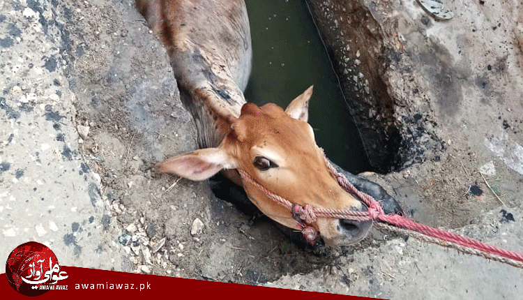 لاڙڪاڻو: انتظاميا جي نااهلي، ڳئون کليل گٽر ۾ ڪِري پئي