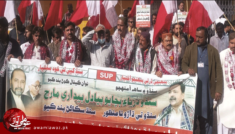 ميرپورخاص(بيورورپورٽ) سنڌو درياءُ تي 6 ڪئنال اڏڻ واري منصوبي خلاف ايس يو پي ۽ مختلف سماجي ۽ قومي تنظيمن جي ڪارڪنن ۽ اڳواڻن پاران پراڻي ميرپور کان ميرپورخاص پريس ڪلب تائين پيادل مارچ منعقد ڪيو ويو پيادل مارچ ۾ شريڪ جيجل ماءُ سوين جوڌن هٿن ۾ بينر ۽ پلي ڪارڊ کڻي 30 ڪلوميٽر جو سفر 4 ڪلاڪن ۾ طئه ڪيو، پيادل مارچ ۾ شريڪ سنڌ جي حلالي پٽن رستي ۾ ايندڙ مختلف ننچن وڏن شهرن، ڳوٺن ۽ اسٽاپن تي گشت ڪندي پنجاب تو سان جھيڙو آ، سنڌو تي ڌاڙو نامنظور، ڪئنال اڏيندين ته پادر کائيندي سميت مختلف نعرا هنيا سنڌ جي حقن جي لاءِ نڪتل جوڌن جي قافلي تي مختلف علائقن ۾ عوام پاران گلن جي ورکا ڪئي وئي، پراڻي ميرپور کان نڪتل پيادل قافلو ميرپورخاص پريس ڪلب اڳيان پهچي احتجاجي ڌرڻي ۾ تبديل ٿي ويو، ڪارڪنن ۽ اڳواڻن ميرپورخاص پريس ڪلب اڳيان اتحاجي ڌرڻو هڻڻ تي روڊ بلاڪ ٿي ويو ۽ ٽريفڪ معطل ٿي وئي، ڌرڻي کي خطاب ڪندي اڳواڻن محمد خان مري، لالا اظهر، عبيدبنگلاڻي، شاهنواز وساڻ، تاج رند، واجد لغاري ۽ ٻين چيو ته سنڌو درياءُ تي نوان ڪئنال اڏڻ سان پنجاب کي ته ترقي ملند پر سڄو سنڌ بنجر بڻجي ويندو پنجاب گذريل 70 سالن کان سنڌ جي پاڻي تي ڌاڙا هڻي رهيو آهي گرين پاڪستان جي نالي ۾ اسان کي ڪوڙا انگ اکر ٻڌائي دوکو ڪيو پيو وڃي. ھن چيو ته گريٽر ٿر ڪئنال، چئوبارا منصوبي ۽ گريٽر بلوچستان ڪئنال منصوبي کانپوءِ 35 لک ايڪڙ زمين نه پر92 لک ايڪڙ بنجر زمينون پوکڻ لاءِ سنڌو مان پاڻي کنيو ويندو، جنھن سان سنڌ تباھ ٿي ويندي اڳ ئي پاڻي جي کوٽ جي ڪري سنڌ جي زراعت تباھ ٿي رهي آهي هن چيو ته سنڌو تي نوان ڪئنال اڏڻ اعلان سنڌ جي ماڻهن لاءِ ڊيٿ وارنٽ جاري ڪرڻ جھڙو آهي .