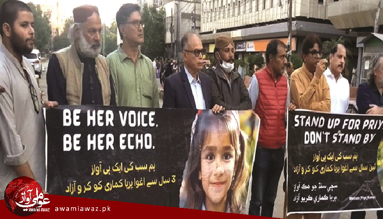 ڪراچي ( رپورٽر) 4 سال اڳ سنگرار سکر مان اغوا ٿيل ستن سالن جي ٻارڙي پريا ڪماري جي بازيابي لاءِ پريا ڪماري ايڪشن ڪميٽي جي سڏ تي ڪراچي پريس ڪلب ٻاهران احتجاجي مظاهرو ڪيو ويو مظاهري جي اڳواڻي لياقت جلباڻي، سهڻي پارس،آفاق ڀٽي ۽ ٻين ڪئي،هنن چيو ته پوليس پريا ڪماري کي بازياب ڪرائڻ ۾ ناڪام ٿي وئي آهي سنڌ جي گهرو وزير جي ڪيل ڳالهين تي عمل نه ٿيو. هنن چيو ته پريا ڪماري جي گهر ۾ 3 سالن کان غم واري صورتحال آهي جيڪڏهن پريا ڪماري بازياب نه ٿي ته فيبروري مهيني جي آخر ۾ هڪ وڏو احتجاج ڪيو ويندو.