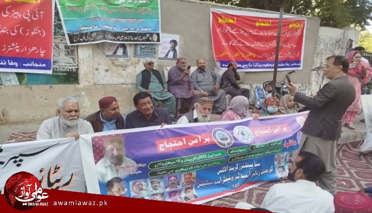 ڪراچي پريس ڪلب اڳيان رٽائرڊ ملازمن جي تنظيمن وفا پينشرن جي ترقي ۽ وڌا واري تنظيم سنڌ، سنڌ پينشنرز گرينڊ الائنس ۽ گورنمينٽ رٽائرڊ ايمپلائيز ويلفيئر ايسوسيئيشن جي سڏ تي احتجاج ڪيو ويو.، وڏي انگ ۾ رٽائرڊ ملازمن شرڪت ڪئي.
