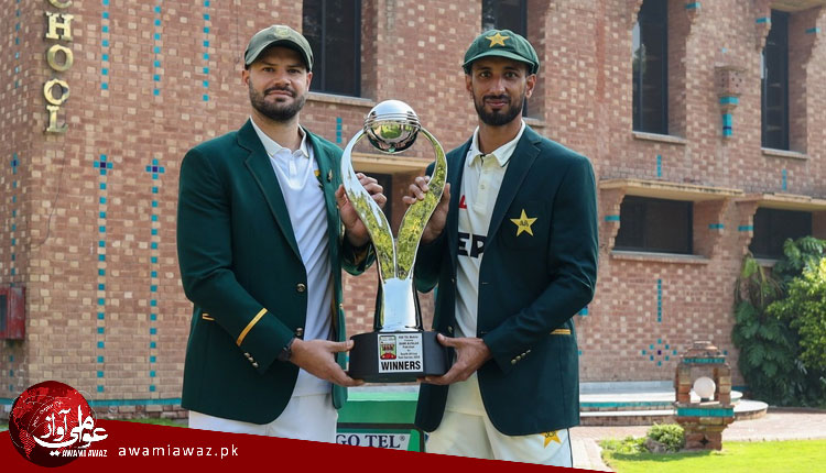 لاهور (ويب ڊيسڪ)پاڪستاني ڪپتان شان مسعود ۽ ڏکڻ آفريڪا جي قائد ايڊن مارڪرم نيشنل ڪرڪيٽ اڪيڊمي لاهور ۾ ٽيسٽ سيريز جي ٽرافي جي مهورت ڪري ڇڏي.