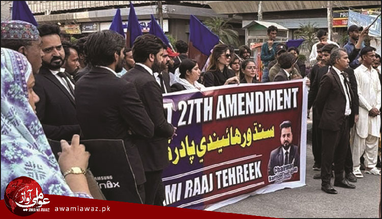 سکر (رپورٽ: شفيع محمد ابڙو) سنڌ هاءِ ڪورٽ بار ايسوسيئيشن پاران 27 هين آئيني ترميم خلاف احتجاجي تحريڪ  جو اعلان ڪيو ويو، جڏهن ته ملڪ مان وڪيلن کي اسلام آباد ٽول پلازا تي ملڪي  سطح جي ڌرڻي ۾ شرڪت جي اپيل ڪئي وئي. ان سلسلي ۾ هاءِ ڪورٽ بار ايسوسيئيشن، ضلعي بار سکر ۽ ضلعي بار خيرپور جي صدرن ۽ جنرل سيڪريٽرين گڏيل پريس ڪانفرنس ڪندي 27 هين آئيني ترميم کي عدليا جي خودمختياري تي وار قرار ڏيندي سخت ردعمل جو اظهار ڪيو. پريس ڪانفرنس ۾ جڊيشل ڪميشن جي ميمبر ۽ صدر هاءِ ڪورٽ بار سکر قربان ملاڻو ايڊووڪيٽ، جنرل سيڪريٽري آچر گبول، ضلعي بار سکر جي صدر علي احمد پٺاڻ، جنرل سيڪريٽري ذوالفقار علي ملاڻو ۽ خيرپور ضلعي بار جي صدر اعجاز علي چانڊيو شرڪت ڪئي.  وڪيل اڳواڻن چيو ته 27هين آئيني ترميم رياستي ادارن جي وچ ۾ اختيارن جي توازن کي بگاڙڻ جي ڪوشش آهي جيڪا عدليا جي آزادي لاءِ سنگين خطرو آهي.  انهن چيو ته سنڌ جي وڪيل برادري عدليا جي خودمختياري ۽ آئين جي بالادستي لاءِ ڪنهن به قرباني کان پاسو نه ڪندي. قربان ملاڻو ايڊووڪيٽ چيو ته جلد ئي سياسي، سماجي ۽ قومپرست جماعتن سان صلاح مشورا مڪمل ڪري اسلام آباد ٽول پلازا تي ملڪ گير دهرڻو شروع ڪيو ويندو. هن واضح ڪيو ته هي تحريڪ قانون، انصاف ۽ آئين جي تحفظ لاءِ هڪ تاريخي جدوجهد هوندي.  جيڪڏهن حڪومت عدليه ۾ مداخلت جاري رکي ته سڄي ملڪ ۾ وڪيل سخت احتجاجي عمل شروع ڪندا .