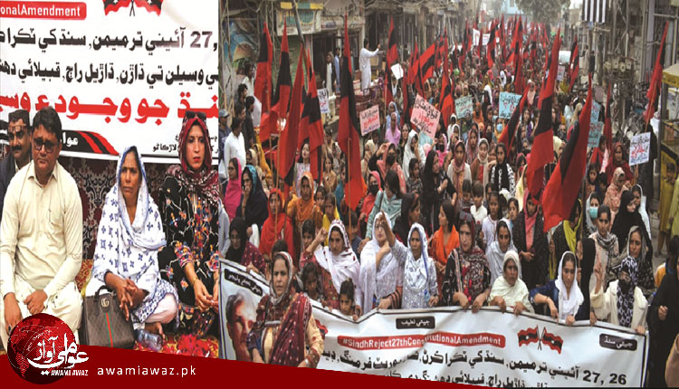 لاڙڪاڻو (بيورو) ستاويهين آئيني ترميم، ڪارپوريٽ فارمنگ منصوبن، سنڌو درياهه تي نون ڪينالن ۽ ڊيمن، سنڌ جي وسيلن تي ڌاڙن ۽ ڌاڙيل راڄ خلاف عوامي تحريڪ ۽ سنڌياڻي تحريڪ طرفان باقراڻي روڊ کان ريلي ڪري جناح باغ چوڪ تي ڌرڻو هنيو ويو.  مارچ جي اڳواڻي عوامي تحريڪ جي مرڪزي صدر ايڊووڪيٽ وسند ٿري، سنڌياڻي تحريڪ جي مرڪزي صدر عمره سمون، عوامي تحريڪ جي مرڪزي سينيئر نائب صدر نور احمد ڪاتيار، مرڪزي جنرل سيڪريٽري ايڊووڪيٽ ساجد حسين مهيسر، سنڌي هاري تحريڪ جي مرڪزي صدر غلام مصطفي چانڊيو، سنڌي شاگرد تحريڪ جي مرڪزي صدر ايڊووڪيٽ نويد عباس ڪلھوڙو، خالق گنڌرو، پرهه ملاح، سرمد سائينداد خاصخيلي، ڊاڪٽر ماروي سنڌو، ستار رند، لال جروار، ايڊووڪيٽ راحيل ڀٽو، ماهه نور ملاح، سڀاني ڏاهري، شمشاد ٻپڙ، ايڊووڪيٽ ريحانا جتوئي، پارس ڀٽي، ايڊووڪيٽ نجيب الرحمان مھيسر، ڪاشف ملاح، ايڊووڪيٽ اظهار دائودپوٽو، علي حسن وڪو، ڊاڪٽر دلدار لغاري، ايڊووڪيٽ سرواڻ جتوئي، قادر ڀٽو، پرهه سومرو، ايڊووڪيٽ آصف کوسو، منصور ٻپڙ، حسين سومرو، خالد تنيو ۽ ٻين اڳواڻن ڪئي. ان موقعي تي مارچ کي خطاب ڪندي وسند ٿري چيو ته پارليامينٽ کي رٻڙ اسٽيمپ بڻايو ويو آهي. ملڪ هلائڻ جا فيصلا واشنگٽن مان ٿي رهيا آهن. آمريڪا سان ڳجهي ڊيل ڪري سنڌ ۽ بلوچستان جا وسيلا آمريڪا حوالي ڪيا ويا آهن. پارليامينٽ بدران اسپيشل انويسٽمينٽ فيسليٽيشن ڪائونسل وسيلي ملڪ هلايو پيو وڃي. ستاويهن آئيني ترميم وسيلي قائداعظم محمد علي جناح جي پاڪستان جو قتل ڪيو ويو آهي. عدالتون مفلوج بڻايون ويون آهن. ملڪ کي هڪ دفعو وري 1971 طرف ڌڪيو پيو وڃي. ڪارپوريٽ فارمنگ منصوبن وسيلي مظلوم قومن کي پنهنجي وطن ۾ ئي بي وطن ڪيو پيو وڃي. پيپلزپارٽي ڪرسي خاطر سنڌ جو انچ انچ وڪرو ڪري ڇڏيو آهي. پ پ پ صدارتي ڪرسي عيوض سنڌ جي زمينن جو سودو ڪيو آهي. بلاول ڀٽو زرداري کي وزيراعظم بڻائڻ لاءِ سنڌ جا وسيلا وڪرو پيا ڪيا وڃن. هن چيو ته ڌاڙيلن تائين نيٽو جا هٿيار ڪيئن ٿا پهچن، ان جي شفاف عدالتي جاچ ڪئي وڃي. ڌاڙيلن جي سرپرستي ڪندڙ سرڪاري سردارن کي گرفتار ڪري عبرتناڪ سزا ڏني وڃي. هن چيو ته امڪاني 28هين ترميم وسيلي سنڌ کي ٽڪرا ڪرڻ جي سازش ڪئي پئي وڃي. عمره سمون چيو ته سنڌياڻين سدائين آمريتن کي للڪاريو آهي، هن آئيني آمريت خلاف به ڀرپور جدوجهد ڪئي ويندي. هن چيو ته قلم 144 انگريز سرڪار طرفان عوام کي غلام رکڻ لاءِ آندو ويو هو. جڏهن ته امڪاني 28هين آئيني ترميم وسيلي سنڌ کي ٽڪرا ڪرڻ جي سازش، ستاوھين آئيني ترميم، ڪارپوريٽ فارمنگ منصوبن، سنڌو درياھ ۽ ان جي ڀرتو ندين تي نون ڪينالن ۽ ڊيمن، سنڌ جي وسيلن تي ڌاڙن، ڪارو ڪاري ۽ ڌاڙيل راڄ خلاف قراردادون منظور ڪيون ويون.
