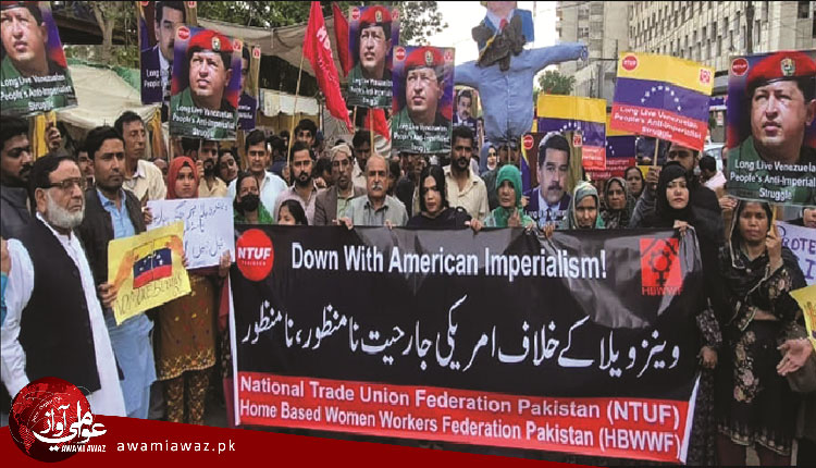 ڪراچي (رپورٽر ) آمريڪا طرفان وينزويلا مٿان جنگي حملي ۽ ان جي صدر نڪولس مادورو ۽ سندس گهر واري کي اغوا ڪري آمريڪا کڻي وڃڻ خلاف ڪراچي جي سول سوسائٽي جي اڳواڻن ناصر منصور، عبدالخالقجوڻيجو ،ڪامريڊ زهره،اقبال ابڙو، ڪامريڊ گل رحمان ۽ ٻين جي اڳواڻي ۾ ڪراچي پريس ڪلب ٻاهران احتجاج ڪندي آمريڪا جي صدر ٽرمپ جي پتلي کي باهه ڏئي وئي. نيشنل ٽريڊ يونين فيڊريشن پاڪستان، هوم بيسڊ ويمن ورڪرز فيڊريشن پاڪستان ۽ ٻين تنظيمن جي سهڪار هيٺ وينزويلا خلاف جاري آمريڪي سامراجي هٿياربند جارحيت جي خلاف احتجاجي مظاهرو ڪيو ويو۔ مظاهري ۾ وينزويلا جي عوام جي سامراج دشمن جدوجهد سان يڪجهتي ۽ آمريڪي جنگي جنون جي سخت مذمت ڪئي وئي۔ شرڪت ڪندڙن وٽ وينزويلا جا جھنڊا، انقلابي اڳواڻ هوگو شاویز ۽ اغوا ٿيل صدر نڪولس مادورو جون تصويرون هيون۔ اڳواڻن مطالبو ڪيو ته وينزويلا مٿان جنگي حملو ڪرڻ ۽ ان جي صدر ۽ سندس گهر واري کي اغوا ڪرڻ واري عالمي قانونن جي ڀڃڪڙي ڪرڻ تي آمريڪا جي صدر ٽرمپ جي خلاف عالمي عدالت ۾ ڪيس هلايو وڃي، وينزويلا جي صدر مادورو ۽ سندس زال سيليا فلورس کي فوري طور آزاد ڪيو وڃي، پاڪستان حڪومت طرفان ٽرمپ جهڙي جنگي جنوني کي نوبل امن انعام ڏيڻ لاءِ تجويز ڪرڻ تي دنيا جي مظلوم عوام کان معافي ورتي وڃي ۽ سموري دنيا جون امن پسند ۽ جمهوري قوتون سامراج جي بربريت خلاف مقابلو ڪرڻ لاءِ اٿي بيهن ،هنن چيو ته آمريڪا جي وينزويلا خلاف جنگ دنيا جي سمپورن آزاد ملڪن ۽ عوام خلاف کليل ڌمڪي آهي ۽ آمريڪا عراق تي حملي جي لاءِ ڪيميائي هٿيارن جي موجودگي جي من گهڙت سازش بعد اڄ نشي آور شين جي اسمگلنگ جي آڙ ۾ وينزويلا جي عوامي حڪومت کي جنگي هٿيارن وسيلي خاتمي وسيلي دنيا جي تيل جي وڏن ذخيرن تي قبضو ڪرڻ چاهي ٿو، ان مقصد لاءِ آمريڪي ڪمپنين جي مفادن جي محافظ ڪٺ پتلي حڪومت مڙهڻ جي سازش ٿي رهي آهي، هنن چيو ته ٽرمپ پنهنجي سامراجي مزاج ڪري غزه بعد وينزويلا مٿان مجرماڻي جنگ مڙهي آهي ۽ اها جنگ بوليورين انقلاب کي ڪچلڻ ۽ آمريڪا نواز نوآبادياتي نظام مڙهڻ جي ڪوشش آهي، اڳواڻن چيو ته ٽرمپ جي هيء جارحيت لاطيني آمريڪا ۾ آمريڪي مداخلت جي خوني شام جو پراڻو سلسلو آهي. جنهن خلاف سموري دنيا ۾ مزاحمت پيدا ٿيندي.